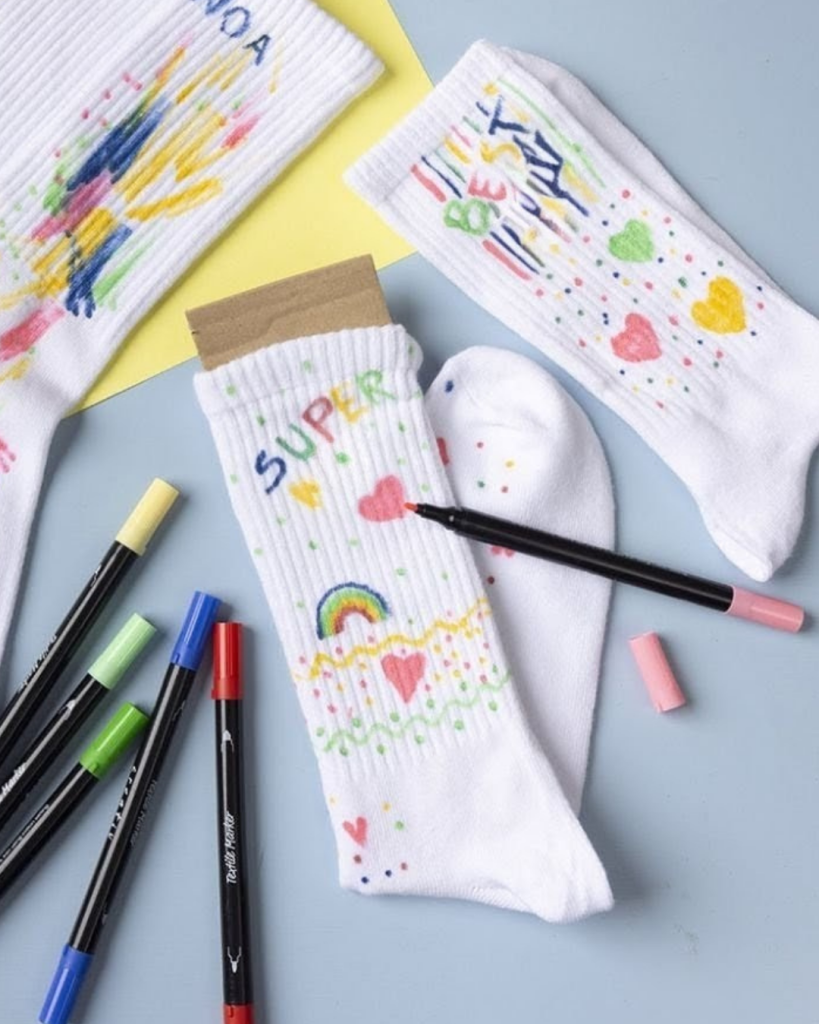 Pendant les vacances scolaires, je vous propose un atelier créatif pour les enfants afin qu’ils puissent décorer leurs propres chaussettes avec les couleurs et les motifs de leur choix
